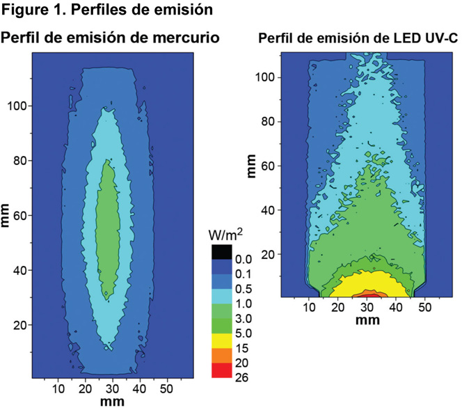 Naturaleza de la fuente de luz, robustez y fiabilidad. El desafío principal del diseño es entender una fuente de luz completamente diferente, a longitudes de onda germicidas ligeramente diferentes. Se debe tener cuidado de caracterizar completamente su robustez y confiabilidad. Una diferencia clave que establece el escenario para este cambio de paradigma en el diseño, es la diferencia en los perfiles de emisión entre estas dos lámparas (Figura 1). Tan sólo en base a este diagrama, es fácil ver la necesidad de un cambio en la geometría del diseño del reactor UV. Las lámparas de mercurio requieren un diseño cilíndrico, mientras que las lámparas UV-C tienen un perfil de emisión de punto y pueden usar, pero no requieren, un perfil cilíndrico. Además de tener un perfil de emisión fundamentalmente diferente, también se debe examinar la salida espectral de las lámparas LED UV-C. Con la popularidad de las lámparas de mercurio de baja presión, se ha pensado de 254 nm como la longitud de onda ideal, a pesar de que el pico de eficacia germicida cae entre 260 y 270 nm, dependiendo del patógeno específico. Las lámparas LEDs UV-C son casi monocromáticas (la mayoría de la salida cae dentro de un intervalo de 10 nm), pero pueden ser diseñadas en una variedad de longitudes de onda dentro del rango germicida para dirigirse a patógenos específicos o a la sensibilidad UV general del patógeno máximo. (Por ejemplo, 255, 265, 275 nm, etc.). La elección de longitud de onda del diseñador suele depender de una combinación de costo, duración, patógeno de interés y producción de intensidad UV. Además, dada la falta de experiencia con esta nueva fuente de luz innovadora, los fabricantes deberán pre-examinar extensamente las lámparas LED UV-C para confiar plenamente en la robustez y emisión de estos dispositivos con el tiempo. Una instalación de pruebas y mediciones de UV-C LED es fundamental para obtener estos datos tan importantes.