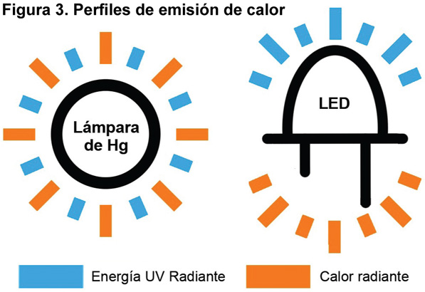 Gestión térmica. El principal desafío de diseño es gestionar el calor emitido por las lámparas LEDs UV-C para garantizar una larga vida de la lámpara. Uno de los beneficios clave de los sistemas basados en LED es que no transfieren calor al agua (Figura 3). Las lámparas LEDs emiten toda su luz en la superficie frontal del dispositivo y el calor en la superficie posterior, mientras que las lámparas de mercurio emiten luz y calor a través de la misma superficie. Las lámparas LED UV-C emiten más calor que las lámparas a base de mercurio, que a su vez deben ser manejadas correctamente. Esto se puede hacer a través de una variedad de formas y ayudará con la longevidad del sistema. Se necesitan nuevos conjuntos de habilidades o especialistas para llevar a cabo esta tarea con eficacia. Si se mantienen altas temperaturas en la unión LED, la salida UV del LED disminuirá y con el tiempo la eficacia de la desinfección del sistema se reducirá. La implementación de técnicas térmicas de reducción de calor y el monitoreo del calor es clave para mantener lámparas LED UV de larga duración. Dependiendo del uso, el intervalo de reemplazo de estas lámparas puede ser de varios años, en comparación con los requisitos de reemplazo anual de las lámparas convencionales de mercurio.