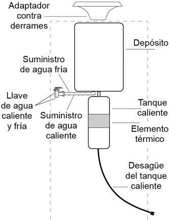 Cualquiera de estas situaciones necesitará la reparación de la refrigeración sellada o el reemplazo del enfriador. La falta de agua caliente puede ser causada por un termostato, un limitador de calor o un elemento térmico defectuoso (suponiendo que el interruptor del tanque caliente esté encendido). Si el enfriador se queda totalmente vacío con el tanque caliente encendido, probablemente activará el limitador. La mayoría se pueden restablecer con el botón en el limitador. El elemento térmico generalmente forma parte del tanque de agua caliente, por lo que podría ser necesario reemplazar el tanque de agua caliente si el elemento es el problema. Las fugas pueden ser a causa de un grifo o un tubo de conexión defectuoso. Si la fuga proviene de la parte superior del depósito, es muy probable que se trate de una botella agrietada. Quite la botella, deje que salga un poco de agua (de un cuarto a medio galón), seque el agua que quedó sobre y alrededor del enfriador, luego coloque una botella nueva y revise si hay fugas después de varios minutos.