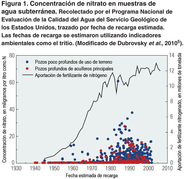 Como se muestra en la Figura 1, las concentraciones de nitrato en el agua subterránea han aumentado con el transcurso del tiempo, de acuerdo con las tendencias en el uso de fertilizantes. Los resultados muestran cómo el nitrato se mueve lentamente a través del agua subterránea. Las concentraciones de nitrato eran elevadas en los pozos poco profundos a principios de la década de los 1960s, mientras que las concentraciones en acuíferos profundos no fueron elevadas hasta la década de los 1970s. Incluso si los insumos de nitrato en la tierra se redujeran drásticamente hoy en día, los efectos no serían evidentes en muchos pozos y arroyos durante décadas debido a la lenta tasa de movimiento del agua subterránea. Este problema es particularmente evidente en muchas comunidades desfavorecidas en áreas como el Valle de San Joaquín de California, que no cumplen con las normas de agua potable para nitratos y contaminantes naturales. La única solución efectiva es mejorar el tratamiento del agua, pero muchas de estas comunidades son las que menos pueden pagar los costos adicionales.
