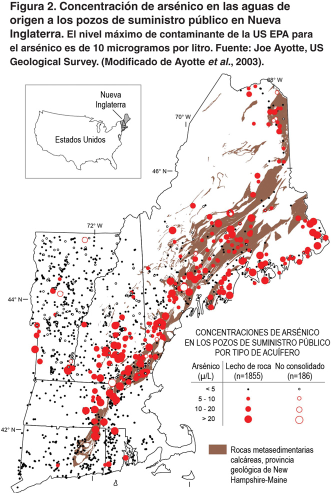 La Agencia de Protección del Medio Ambiente de los Estados Unidos (US EPA, por sus siglas en inglés), regula los suministros públicos de agua para que cumplan con las normas de agua potable, pero no regula los pozos privados. Los propietarios de pozos privados están por su cuenta para monitorear la calidad y mantener la seguridad de sus pozos. Alrededor del 13 por ciento de la población de los Estados Unidos (unos 42 millones de personas), dependen de pozos privados para su suministro de agua potable. La Asociación Nacional de Agua Subterránea (NGWA, por sus siglas en inglés) y varios estados, tienen programas para educar y ayudar a los propietarios de viviendas con pozos privados. Por ejemplo, muchos residentes en Nueva Inglaterra confían en pozos privados completados en roca cristalina, una fuente de altas concentraciones de arsénico en las aguas subterráneas (ver Figura 2). Las agencias ambientales y de salud en Nueva Inglaterra han creado conciencia sobre la necesidad de realizar pruebas de arsénico, pero lograr que las personas actúen ha sido un desafío. El costo, la postergación y el “sesgo optimista” (una tendencia a pensar que uno está más seguro que sus vecinos) se presentan como razones de la falta de pruebas.(3)