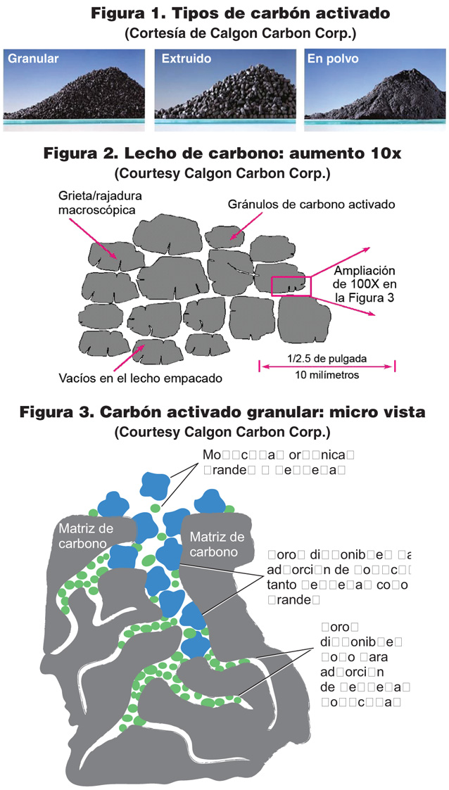 Los medios de carbón activado se fabrican a partir de fuentes carbonosas como carbón, lignito, madera, cáscaras de coco y muchos otros materiales. El proceso de fabricación crea granos de carbono (partículas) con muchos poros, creando una superficie muy grande. Esta superficie atrae contaminantes y los adsorbe. La adsorción es la unión de las moléculas del contaminante a la superficie del medio. Esto se opone a la absorción, que implica la penetración del contaminante en el cuerpo del medio, como en una esponja. El carbón activado está disponible en muchos tamaños de malla; La figura 1 muestra sus diversas formas. Las figuras 2 y 3 muestran este medio en varios grados de ampliación.