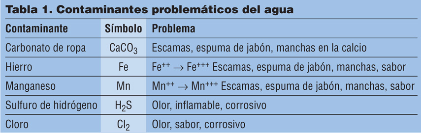 Muchos suministros de agua cruda contienen lo que se conoce como contaminantes del agua problemáticos, sales ligeramente solubles como el carbonato de calcio, hierro y manganeso, el gas disuelto, sulfuro de hidrógeno y el desinfectante, el cloro. Se consideran problemáticos por varias razones que se resumen en la Tabla 1.