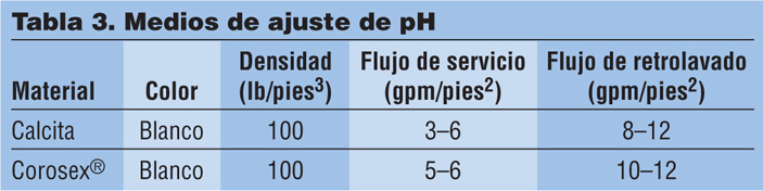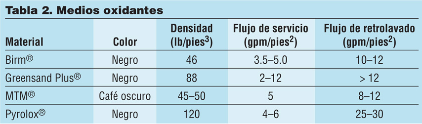 Los agentes oxidantes típicos incluyen: cloro, ozono (O3), peróxido de hidrógeno (H2O2) y, en menor medida, permanganato de potasio (KmnO4). La Tabla 2 enumera los medios disponibles para la oxidación y filtración de los contaminantes anteriores. Estos medios son los más utilizados para aplicaciones industriales, comerciales y residenciales ligeras. La Tabla 3 describe los medios para elevar el pH de los suministros de agua ácida.