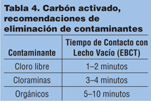 El tiempo de contacto con el lecho vacío (EBCT) se define como el volumen total del lecho del medio dividido por el caudal. En otras palabras, EBCT define la cantidad de tiempo que un contaminante en el agua está en contacto con el medio de carbón activado en un recipiente. La Tabla 4 enumera los requisitos de EBCT para la eliminación de ciertos contaminantes. Debido a la dificultad de eliminar los compuestos de cloramina con los medios estándar de carbón activado granular (CAG), se ha desarrollado un material especializado, el carbón catalítico, que no solo funciona de manera más efectiva con las cloraminas, sino que también elimina más fácilmente el sulfuro de hidrógeno. Este producto tiene las siguientes propiedades: