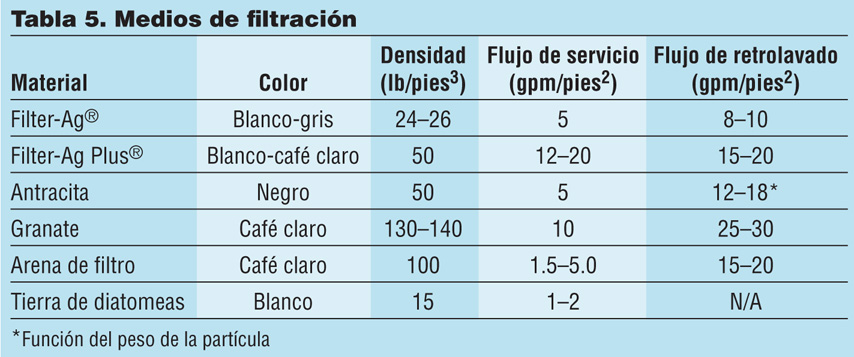 Varios medios diferentes, en su mayoría minerales naturales, se utilizan tanto para la eliminación de sólidos en suspensión como para el soporte de otros medios, como los utilizados para la filtración por oxidación o el ajuste del pH. En general, los medios de mayor densidad se utilizan para capas debajo de la cama o de apoyo, ya que se asentarán en el fondo del recipiente del filtro durante el lavado a contracorriente. En general, es recomendable que las capas superiores del lecho consistan en granos grandes de un medio angular con un área de superficie alta que promueva la captura de sólidos suspendidos grandes, mientras que permite que partículas más pequeñas penetren dentro del lecho para una carga y un lavado más eficientes. Se recomienda que solo los medios que cumplan con la norma AWWA B100-96 y que figuran en NSF 61 se utilicen en todas las aplicaciones de filtración de agua. La Tabla 5 proporciona datos sobre varios medios de filtración. Una descripción de estos medios se presenta enseguida: