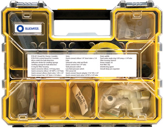 La herramienta de servicio de Bluewater Group USA y los estuches de partes de repuesto ya están disponibles. Contenidos en estuches de transporte resistentes y livianos, estos estuches de servicio tienen todo lo necesario para reparar un purificador Bluewater en un solo viaje. Cada estuche contiene lo siguiente: llave de filtro Pro & Spirit; Llave de filtro Cleone; Extractor de la bomba del mango en T; pinzas Alvin de punta de 15.24 cm (seis pulgadas); Lubricante para juntas tóricas, silicona; Juego de púas de precisión de cuatro piezas Husky; mazo blando Vaughn de 12 onzas (0.3 kg); Herramienta de lanzamiento de collet John Guest y más. Los estuches de repuestos pueden incluir: engranajes y correas; juntas; sensores de conductividad; juntas tóricas; válvulas de verificación; interruptores de presión y mucho más. Descargue el formulario de pedido apropiado, complete y envíe. Póngase en contacto con la empresa para solicitar información sobre repuestos.