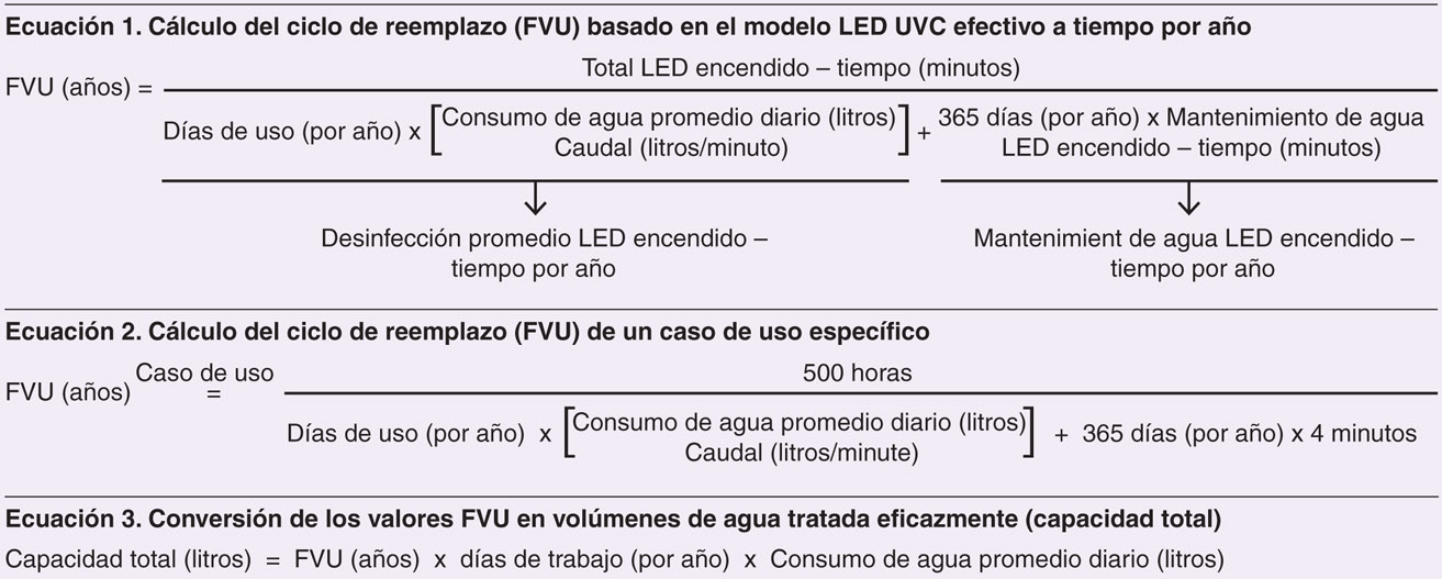 La propiedad de encendido y apagado instantáneo se traduce en una vida útil específica del producto de purificación de agua, que depende igualmente de las características específicas del aparato, así como del comportamiento del usuario. Diferentes casos de uso ilustran la amplia gama de posibles resultados de vida útil mediante propiedades representativas del sistema (caudales) y comportamiento de consumo (volumen de agua dispensada diariamente). El análisis del siguiente caso de uso comprende la evaluación cuantitativa del Final de la Vida Útil (FVU) en años, así como la capacidad de volumen total de agua para demostrar la versatilidad de vida útil de los sistemas de purificación de agua basados en LED UVC.