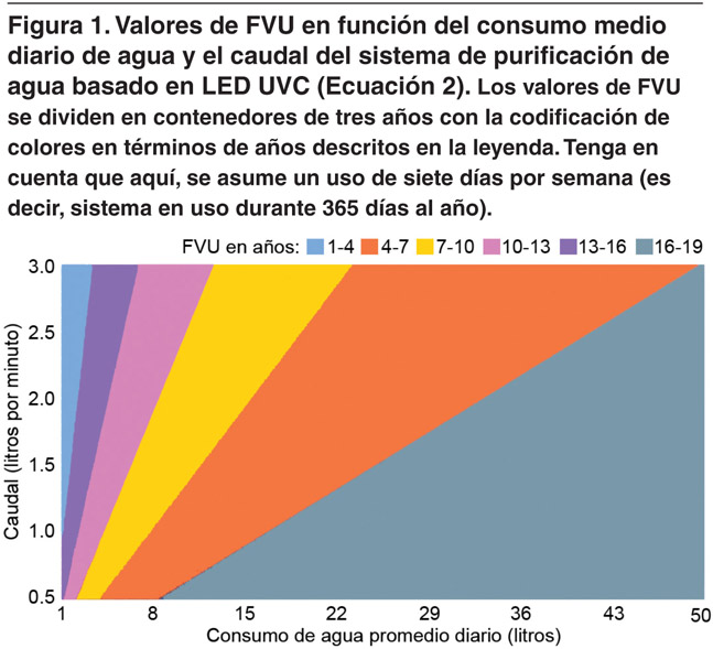 La Figura 1 ilustra los valores de FVU calculados por la Ecuación 2 para un rango de caudales entre 0.5 y tres litros por minuto, y un consumo de agua diario promedio entre uno y 50 litros. Estos rangos de parámetros se han elegido para representar varios escenarios de aplicación, como los sistemas de filtración domésticos debajo del fregadero (UF [normalmente hasta tres L/min], ósmosis inversa [normalmente menos de un L/min] y otros), agua embotellada comercial refrigeradores (rangos hasta más pequeños de un L/m), refrigeradores de agua Enel punto de uso en entornos de oficina (normalmente de 1.5 a 2.5 L/min), así como también para aparatos de agua profesionales para el punto de uso en espacios públicos y de hospitalidad (normalmente más de dos L/min). Dentro de estos rangos de parámetros, el FVU más corto asciende a 0.8 años por 50 litros consumidos por día a un caudal de 0.5 L/min (Figura 1, esquina inferior derecha) y el más largo alcanza los 19 años por un litro consumido por día a tres L/min (Figura 1, esquina superior izquierda). Si bien estos valores son extremos calculados, la mayoría de los valores de FVU (75 por ciento) en esta evaluación se encuentran entre dos y 11 años, con una media de 5.6 años. Esto indica la impresionante variedad de vidas útiles posibles de un producto de purificación de agua basado en LED UVC en el campo, especialmente en comparación con los programas típicos de reemplazo de lámparas UV entre seis y 12 meses.