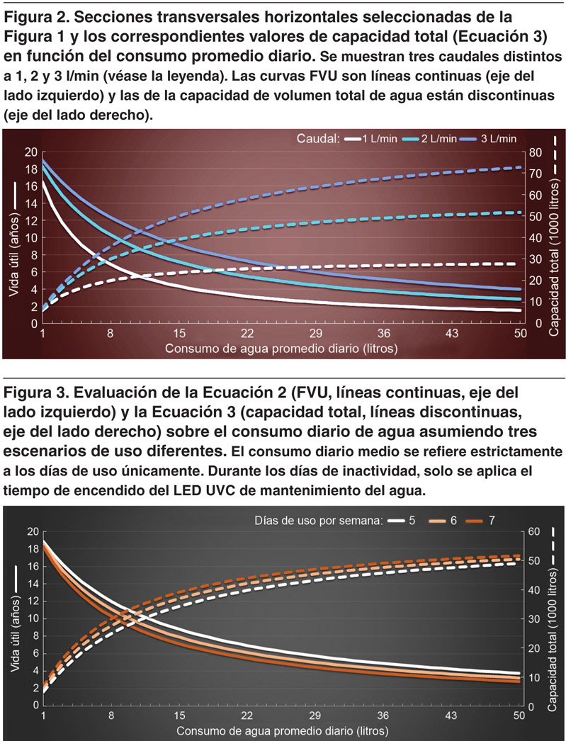 La Figura 2 muestra tres secciones transversales horizontales seleccionadas de la Figura 1 junto con los valores de capacidad total. Se puede reconocer claramente la dependencia no lineal para FVU y la capacidad total en el consumo diario promedio, así como su progresión de curva inversa (Ecuaciones 2 y 3). Cuando aumenta el consumo diario, se trata más agua y se usa menos tiempo de encendido de LED UVC para el mantenimiento del agua (en términos relativos), mientras que la vida útil efectiva del producto disminuye debido a períodos de uso de LED UVC más prolongados por día.