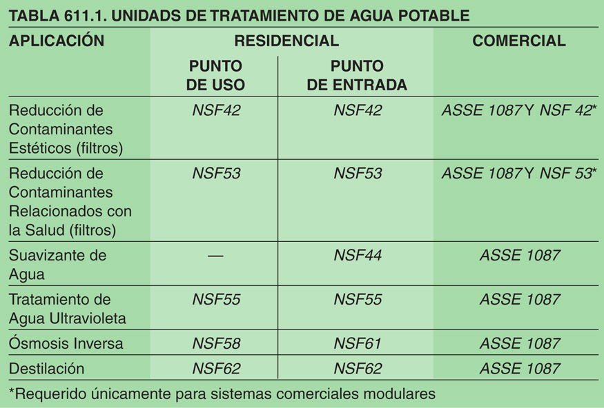 • Las unidades de tratamiento de agua potable deben cumplir con los estándares de referencia aplicables en la Tabla 611.1.