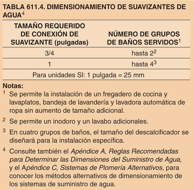 • Los ablandadores de agua residenciales deben dimensionarse de acuerdo con la Tabla 611.4.