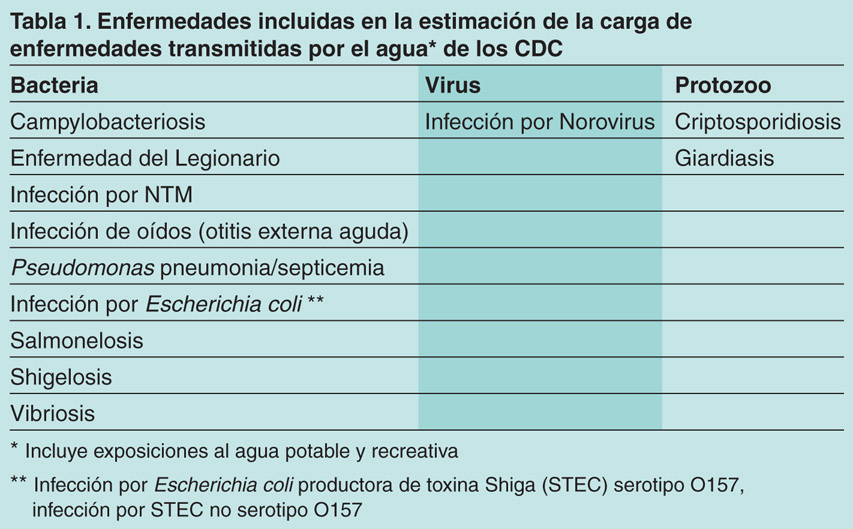 Aunque otras personas han estimado previamente la carga de enfermedades transmitidas por el agua(2), la publicación reciente de EID representa la primera vez que los CDC han evaluado colectivamente una carga de enfermedad de todas las fuentes de agua (potable, recreativa, ambiental) y rutas de exposición (ingestión, contacto, inhalación). Considerando todas estas variables, estiman hasta 12 millones de enfermedades transmitidas por el agua cada año, lo cual resulta en hasta 866,000 visitas a la sala de emergencias, 150,000 hospitalizaciones y 8,870 muertes. En el estudio de los CDC, las enfermedades más prevalentes atribuidas a cualquier fuente de origen hídrico fueron las infecciones del oído (4.67 millones de casos en promedio); norovirus (1.33 millones de casos); giardiasis (415 mil casos); criptosporidiosis (322 mil casos). Los últimos tres organismos están asociados principalmente con síntomas de enfermedades estomacales, incluidos vómitos y/o diarrea.