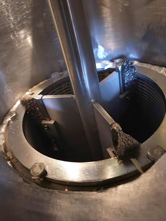 Cuatro cepillos raspadores giran a 8 rpm, lo que resulta en una tasa de limpieza de 32 golpes por minuto. Los cepillos raspadores entran en las ranuras de alambre en cuña y desalojan partículas y sólidos resistentes. Este enfoque permite que los coladores raspadores resisten la obstrucción y la suciedad cuando se enfrentan a sólidos grandes y alta concentración de sólidos.
