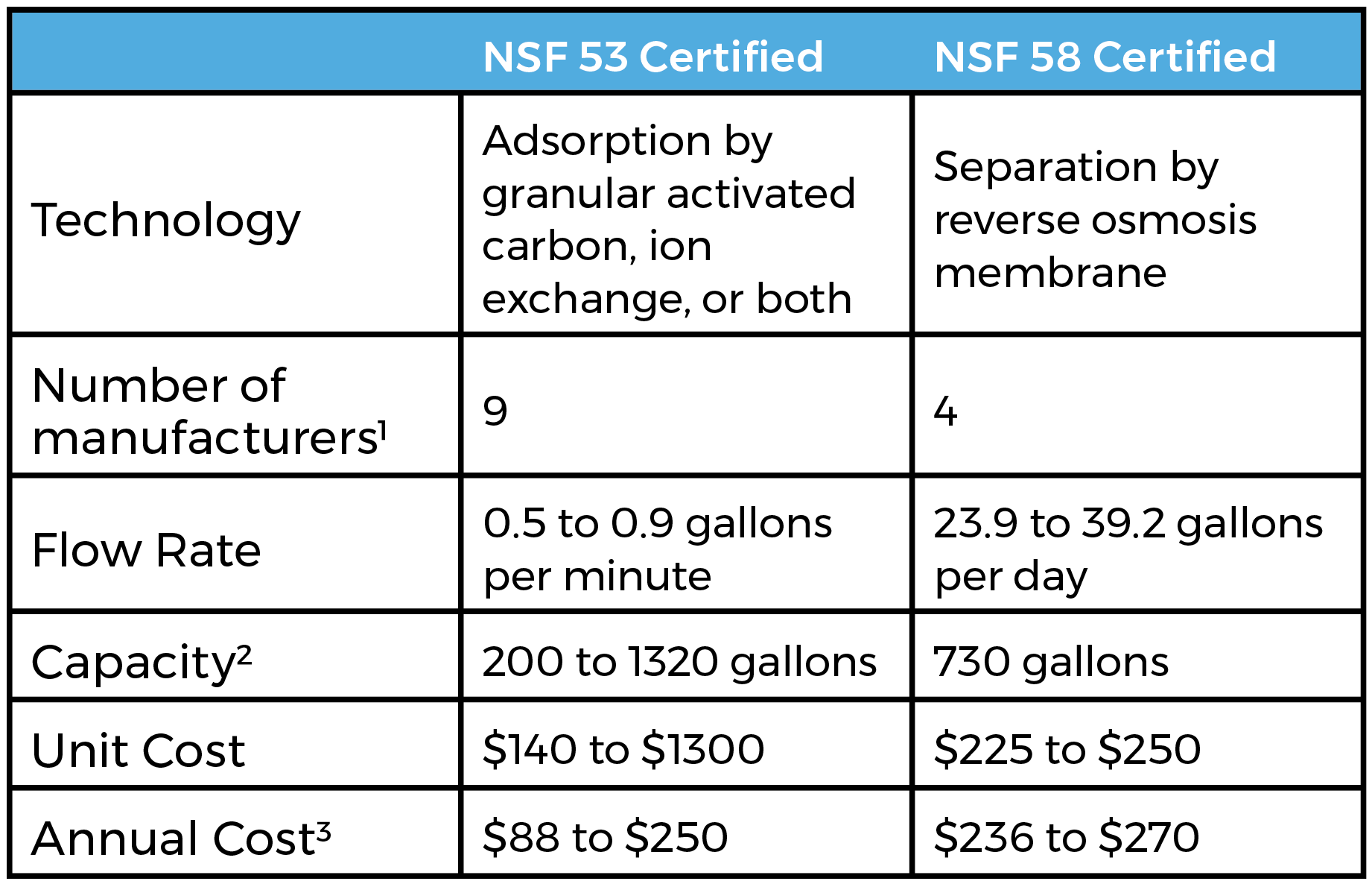 La estimación de capacidad para NSF/ANSI 53 se basa en el volumen de agua tratada declarado por el fabricante. Para NSF/ANSI 58, la estimación se deriva del volumen del tanque de almacenamiento del sistema, aproximadamente 2 galones, factorizado por el uso diario durante un lapso de 365 días.